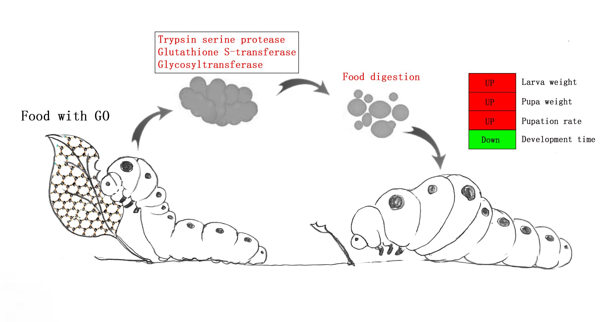 氧化石墨烯已經(jīng)在醫(yī)學(xué)、環(huán)境、能源等領(lǐng)域得到廣泛應(yīng)用。近年來,氧化石墨烯的生物安全性已經(jīng)成為各界學(xué)者關(guān)注的焦點。該研究以玉米螟為研究對象,將氧化石墨烯添加到玉米螟飼料中,玉米螟取食后可顯著的提高取食量,幼蟲體重、蛹重和化蛹率增加,壽命縮短。通過轉(zhuǎn)錄組和蛋白組聯(lián)合分析發(fā)現(xiàn),氧化石墨烯可激活玉米螟體內(nèi)的胰蛋白酶樣絲氨酸蛋白酶、谷胱甘肽S-轉(zhuǎn)移酶、熱休克蛋白和糖基轉(zhuǎn)移酶。通過RNAi試驗驗證結(jié)果表明,胰蛋白酶基因是氧化石墨烯促進玉米螟生長的關(guān)鍵基因之一,該研究為氧化石墨烯的合理開發(fā)利用提供了科學(xué)依據(jù)。