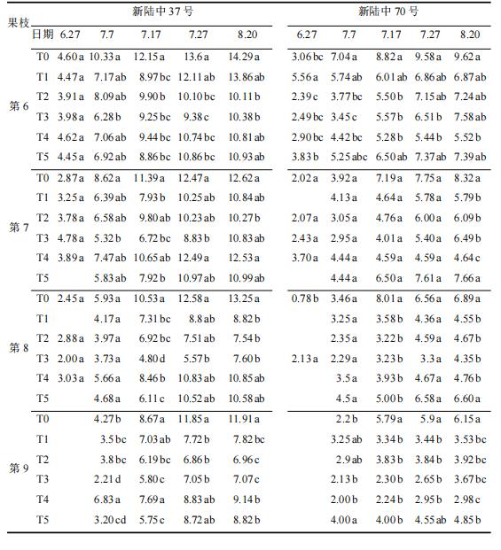 表2-2 不同處理下新陸中37號(hào)與新陸中70號(hào)的第6及以上各果枝長(zhǎng)(cm)