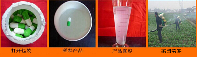 蔬菜壯莖靈膠囊:每瓶60粒,在15公斤--30公斤水中加本品膠囊一粒。可使蔬菜苗長勢茂盛,桿莖粗壯、葉片肥厚,高產(chǎn)優(yōu)質(zhì)。保鮮期長。用于甘藍(lán)、芥菜、芹菜、黃花、大白菜、苴蓮、茼蒿、大青菜、韭菜、空心菜、菠菜、油麥菜等各種無公害蔬菜。對身價高的蔬菜品種可在15公斤水中加本膠囊2--3粒施用,效果更佳。本品PH值中性,遵照使用要求稀釋后噴霧,亦可以和各種農(nóng)藥及葉肥混合使用。稀釋液存放保質(zhì)期30天。